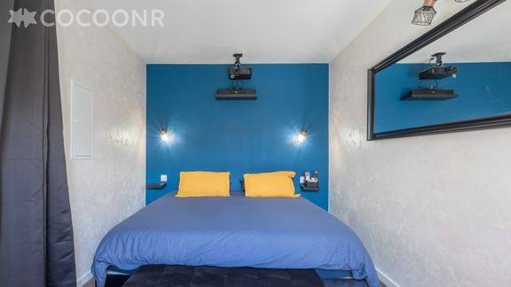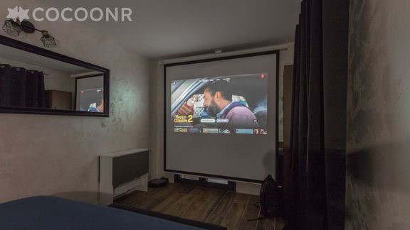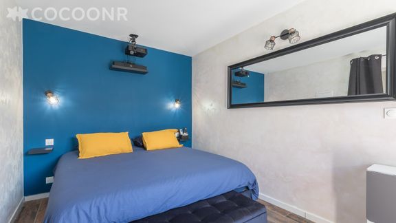 - Un espace nuit de 12 m² avec un lit king-size (180×200) et un vidéoprojecteur