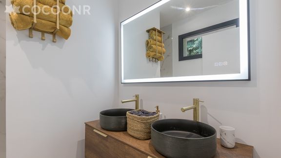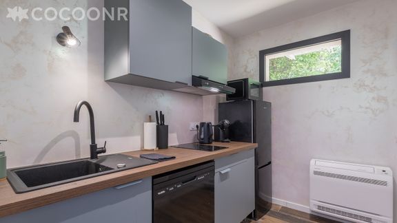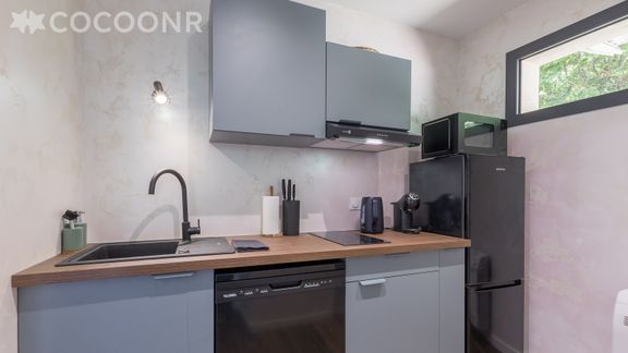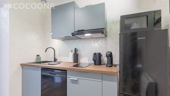 - Un coin repas avec une cuisine équipée : bouilloire électrique, four à micro-ondes, grille-pain, lave-vaisselle, plaques de cuisson...