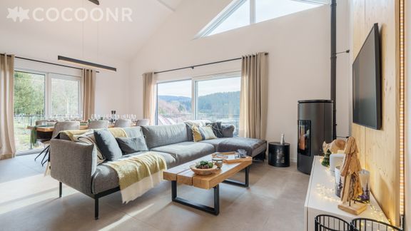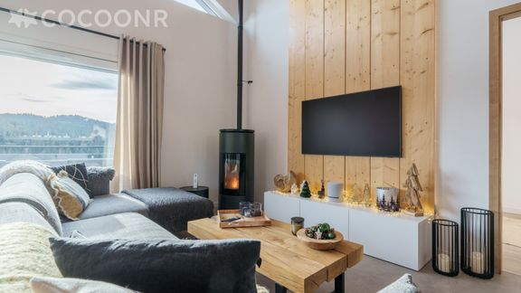 - Une pièce de vie de 45 m² avec canapé, TV, coin repas et poêle à granulés