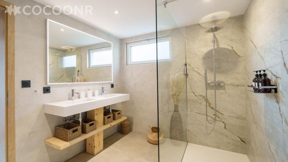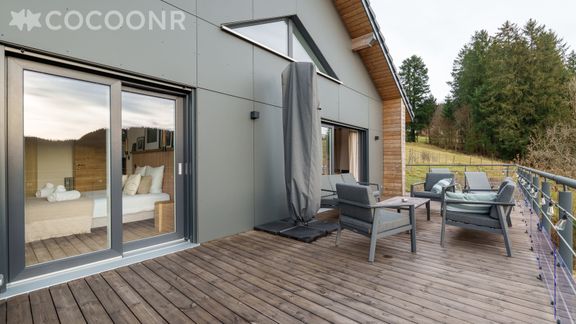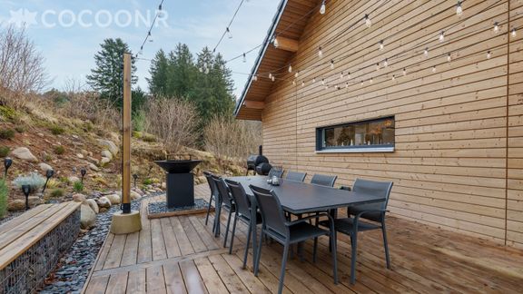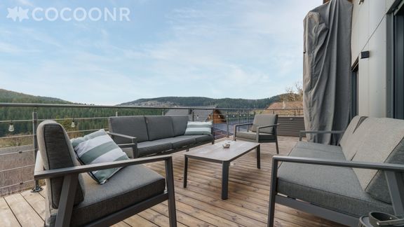 - Une terrasse de 70 m² avec un bain nordique pour 8 personnes (disponible toute l’année) et un brasero