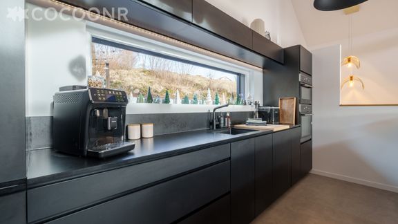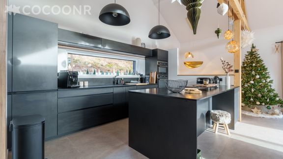 - Une cuisine équipée avec notamment : bouilloire électrique, four, four à micro-ondes, grille-pain, lave-vaisselle, plaques de cuisson, machine à café à grains...