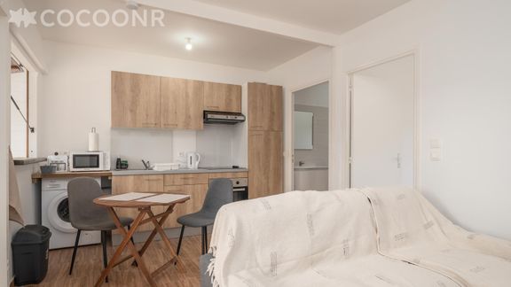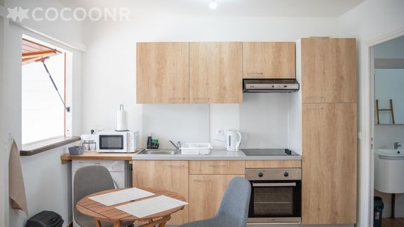 - Une pièce de vie de 16 m² avec TV, canapé, coin repas et une cuisine équipée avec notamment : bouilloire électrique, four, four à micro-ondes, grille-pain, plaques de cuisson...