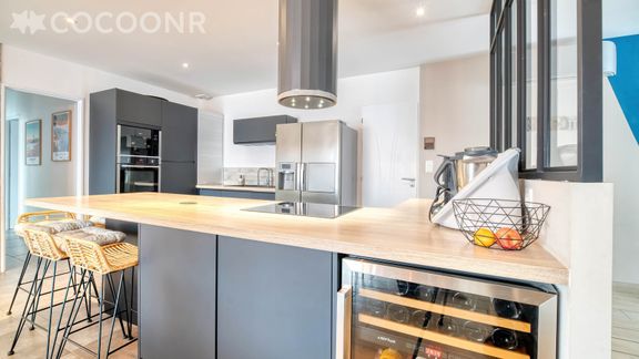 - Une cuisine équipée ouverte sur le séjour, avec notamment : bouilloire électrique, four, four à micro-ondes, grille-pain, lave-vaisselle, plaques de cuisson...
