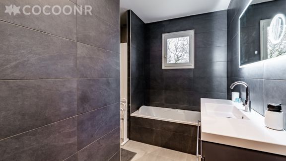 - Une salle de bain avec douche et baignoire