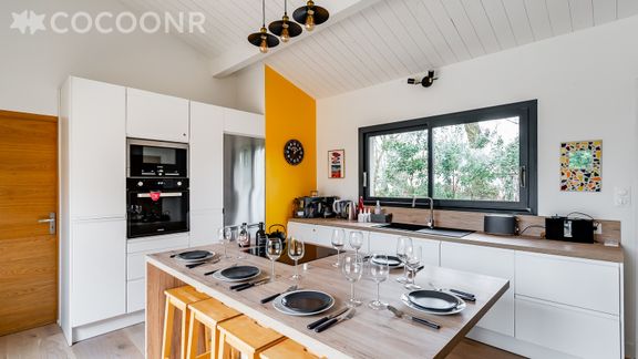 - Une cuisine équipée avec notamment : bouilloire électrique, four, four à micro-ondes, cafetière Nespresso, grille-pain, lave-vaisselle, plaques de cuisson...