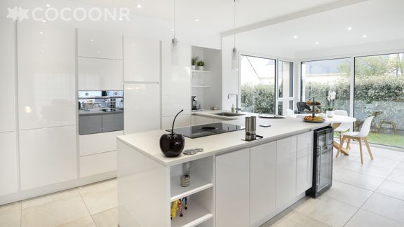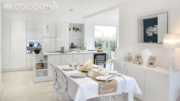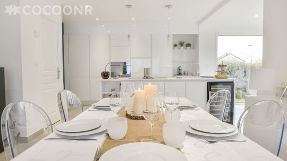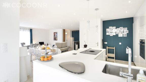 - Une cuisine ouverte équipée avec notamment : four, four à micro-ondes, grille-pain, lave-vaisselle, plaques de cuisson...
