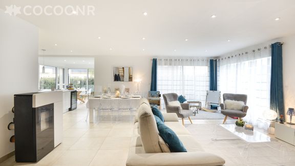 - Une pièce de vie lumineuse, exposé Sud-Ouest, de 40 m² avec un canapé, fauteuils, espace repas
