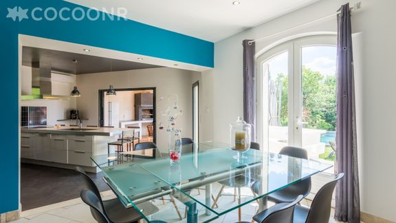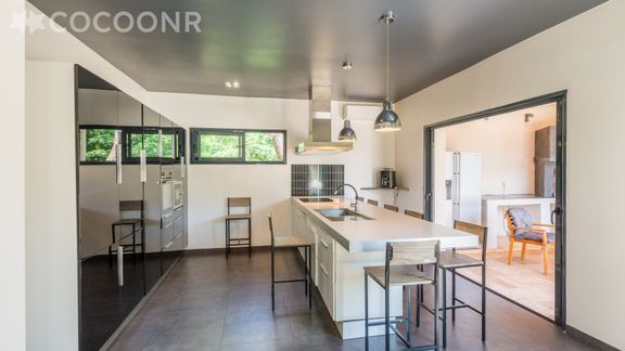 - Très grande cuisine moderne ouverte sur l'espace salle à manger et le séjour. L'espace salle à manger comprend une belle table en verre et 8 chaises. La cuisine est entièrement équipée avec : îlot central avec plaque à induction et évier, 8 assises hautes, lave-vaisselle, four, réfrigérateur, cafetière capsules l'Or maison du café, grille-pain, bouilloire électrique, vaisselle et couverts..