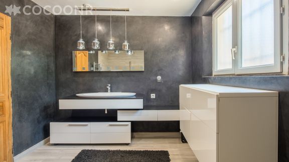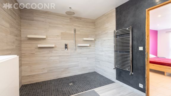 - Salle d'eau spacieuse et design, équipée d'une douche, WC et rangements.