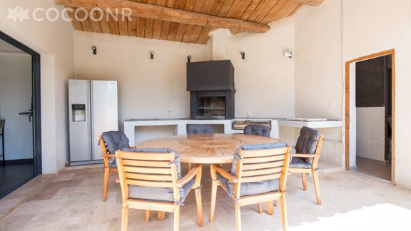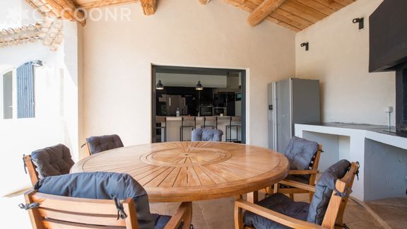 - Cuisine d'été abritée de 20 m² où vous pourrez apprécier un repas au frais lors des journées estivales équipée d'un barbecue, plancha, réfrigérateur et congélateur, plan de travail ainsi qu'une belle table ronde en bois et ses 8 assises. L'accès est direct depuis la cuisine.
