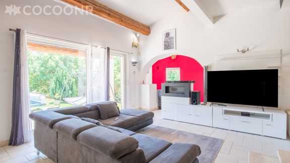 - Pièce à vivre lumineuse grâce à ses belles ouvertures, donnant sur l'extérieur et la piscine, aménagée avec un grand canapé d'angle convertible, meuble et TV écran plat.