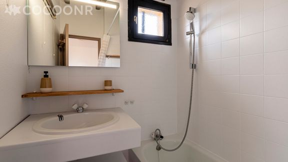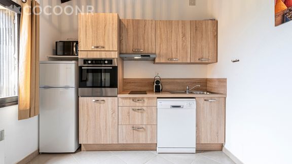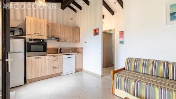 - Une pièce de vie de 16 m² avec une cuisine équipée (four, four à micro-ondes, lave-vaisselle, plaques de cuisson...) et un espace séjour équipé de 2 banquettes (convertibles en couchage pour une personne)