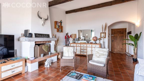 - Une pièce de vie de 25 m² avec vue mer, canapé-lit double, TV et cheminée (bois non fourni)