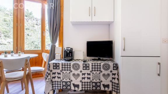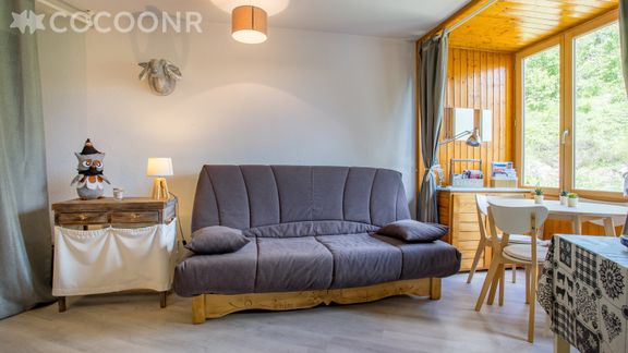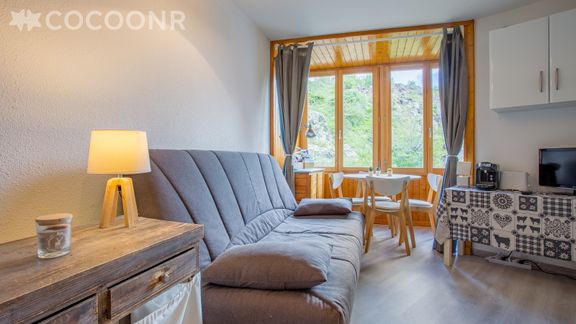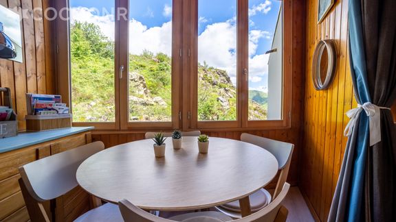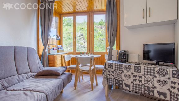 - Pièce à vivre lumineuse avec ses fenêtres vue sur la montagne aménagée avec canapé-lit, meuble et TV écran plat. L'espace salle à manger comprend quant à lui une table ronde et ses 4 assises.