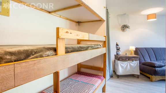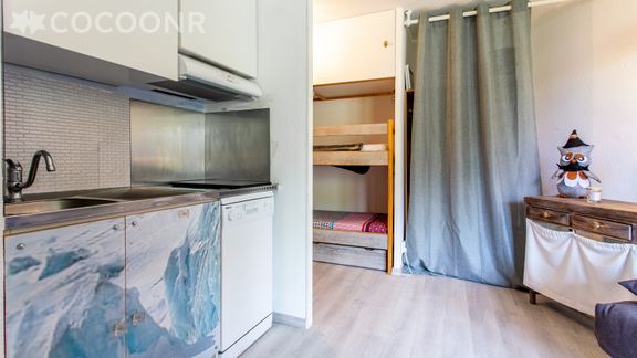 espace de vie vous offrant une vue sur la montagne avec canapé-lit, cuisine entièrement équipée, espace nuit avec lit superposé, salle de bain avec baignoire et WC séparés. Local à skis. Draps et serviettes en supplément.