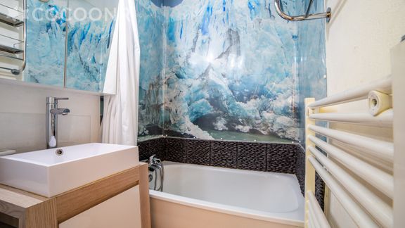 - Salle de bain avec baignoire, vasque et sèche-serviettes.