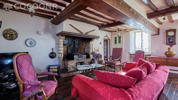 - Une pièce de vie de 30 m² avec TV, cheminée (bois non fourni), canapés, fauteuils et un espace repas