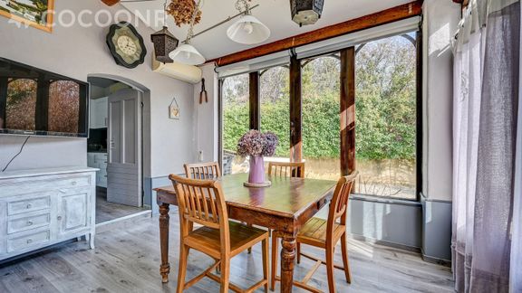 - Une véranda fermée avec coin repas et TV. Les baies vitrées s'ouvrent entièrement sur le jardin