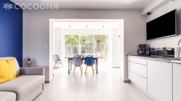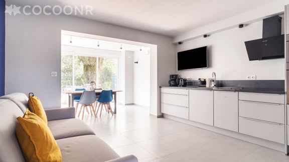 - Une pièce de vie lumineuse de 28 m² avec TV, canapé convertible double (160x200) et espace repas.