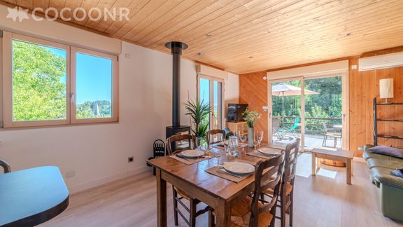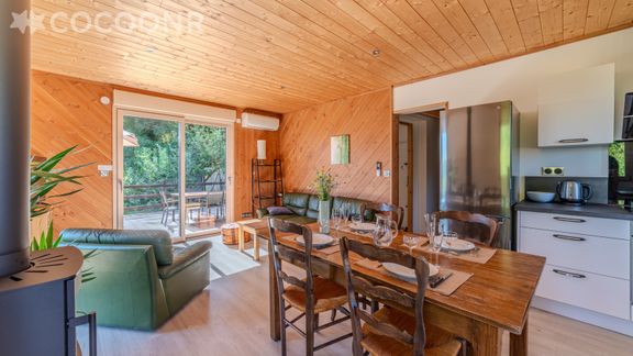 - Une pièce de vie principale avec climatisation, disposant d'un coin salon avec TV, canapé-lit, un bureau et un poêle à bois.