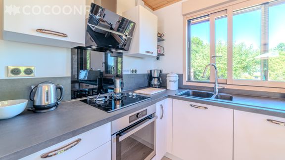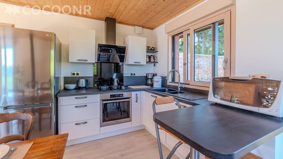 - Une cuisine ouverte équipée, lumineuse et ouverte sur une terrasse, sans vis-à-vis, avec vue sur le lac. À votre disposition : bouilloire électrique, four, four à micro-ondes, grille-pain, lave-vaisselle, plaques de cuisson...