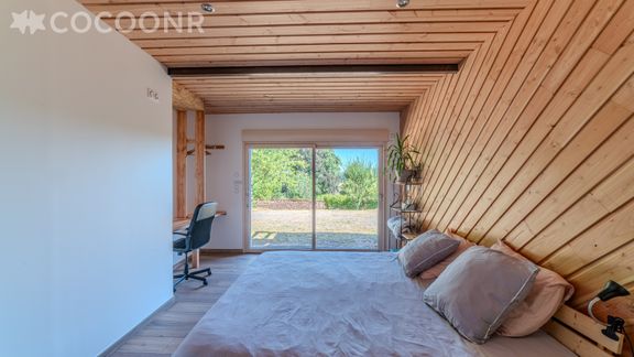- Une chambre-bureau, avec lit king-size (180x200), ouverte sur l'extérieur par une baie vitrée donnant sur le parc