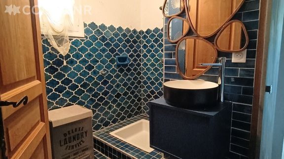 - Chambre 2 : avec un lit double (140×190), salle d'eau, douche et WC séparé et une petite pièce attenante avec un lit simple et un lavabo