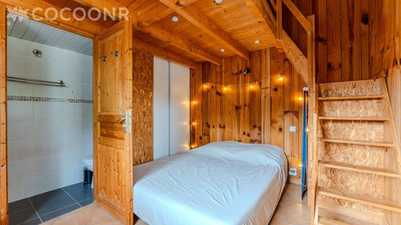 - Chambre 4 : avec un lit queen-size (160×200) et 1 lit enfant sous combles.