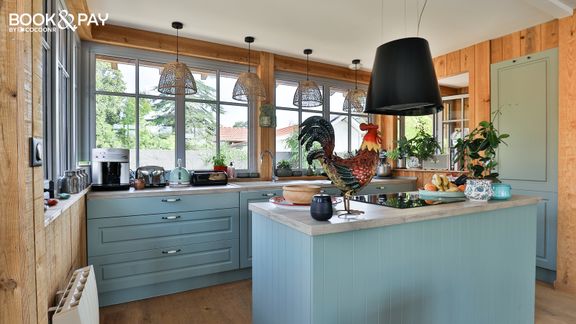 - Une cuisine ouverte équipée avec notamment : bouilloire électrique, four, four à micro-ondes, grille-pain, lave-vaisselle, plaques de cuisson...