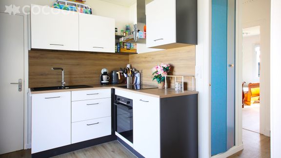 - Une cuisine ouverte et équipée avec notamment : bouilloire électrique, four, four à micro-ondes, grille-pain, lave-vaisselle, plaques de cuisson...