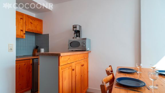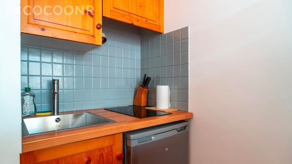 - Une kitchenette ouverte équipée avec notamment : four à micro-ondes, grille-pain, plaques de cuisson...