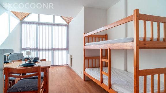 - Une pièce de vie avec canapé-lit double, une table à manger et un lit superposé