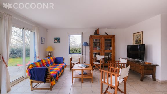 - Une pièce de vie de 70 m² avec TV, canapé et espace repas, grande baie vitrée et accès à la terrasse