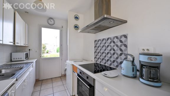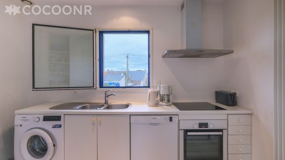 - Une cuisine équipée avec notamment : bouilloire électrique, four, four à micro-ondes, grille-pain, lave-vaisselle, plaque à induction, ainsi qu’un deuxième espace avec un frigidaire