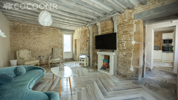 - Une pièce de vie de 20 m² avec canapé, fauteuil et murs de pierres.