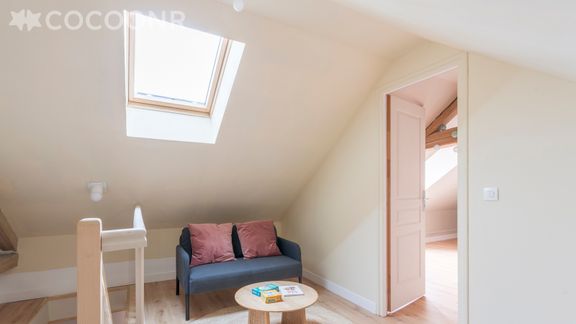 - Un palier avec un petit canapé et une table qui est un coin détente où vous trouverez quelques jeux et livres enfants