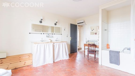 - Une grande salle de bain avec double vasque et baignoire.