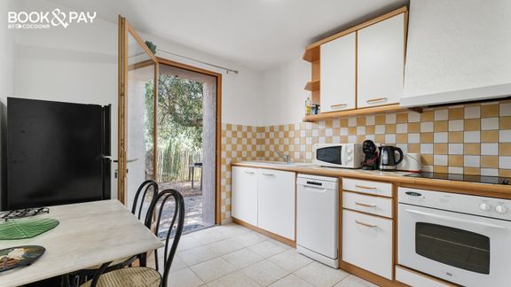 - Une cuisine équipée avec notamment : bouilloire électrique, four, four à micro-ondes, grille-pain, lave-vaisselle, plaques de cuisson...