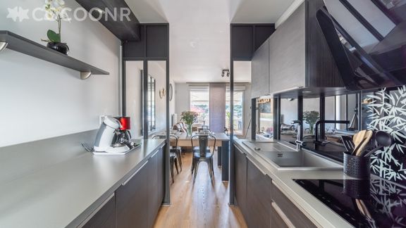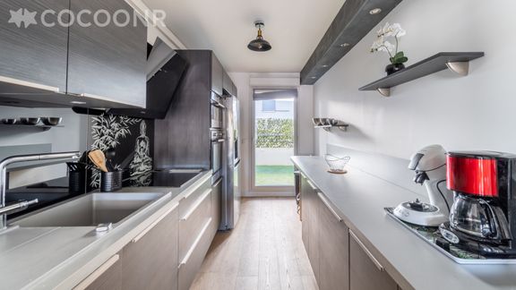 - Une cuisine équipée avec notamment : bouilloire électrique, four, four à micro-ondes, grille-pain, lave-vaisselle, plaques de cuisson, cafetière à dosettes Nespresso...