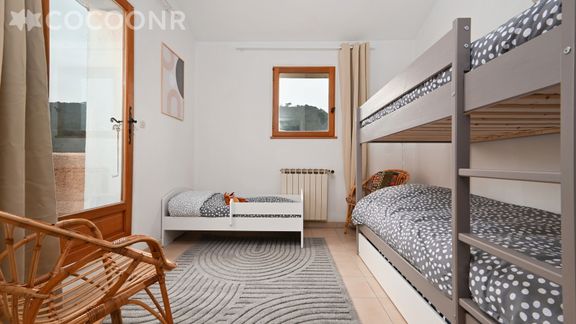 - Chambre 3 : chambre avec un lit simple pour enfant (90 x 140) et un lit superposé (2 couchages), donnant du la terrasse