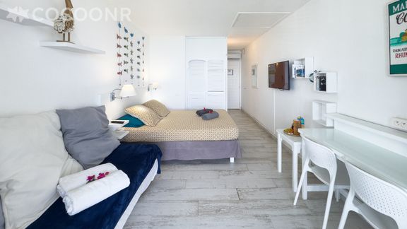- Une pièce de vie de 20 m² : avec une TV, un lit simple, un lit queen-size (160×200) et un coin repas, ouverte sur l'extérieur