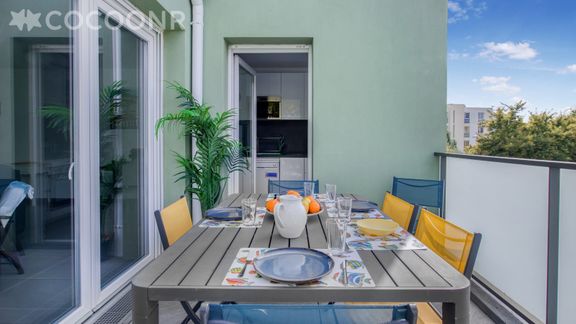 - Une terrasse de 9 m² exposé ouest avec vue sur jardin, avec mobilier et pergola pour profiter des beaux jours.