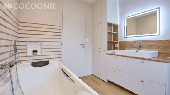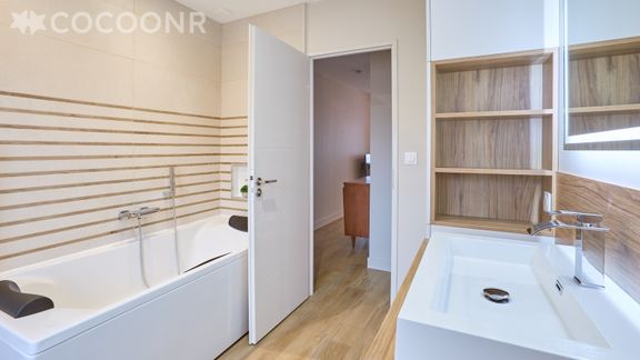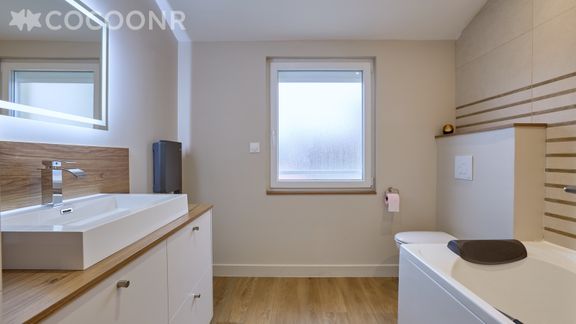 - Une salle de bain avec baignoire et WC