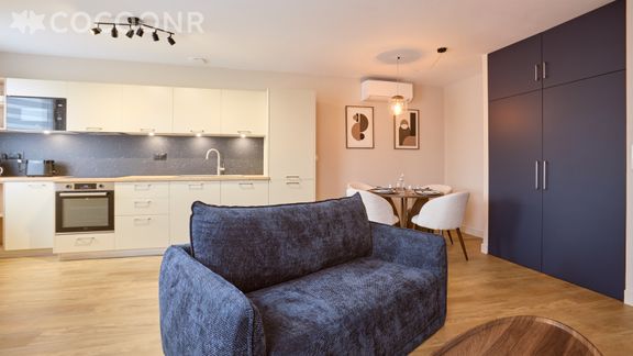 - Une pièce de vie de 30 m² avec TV, canapé-lit double, coin repas et une cuisine équipée avec notamment : four, four à micro-ondes, grille-pain, lave-vaisselle, plaques de cuisson...