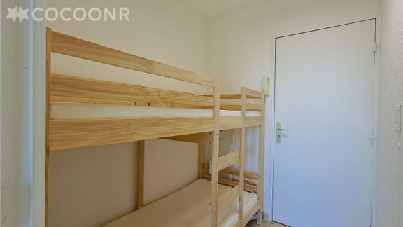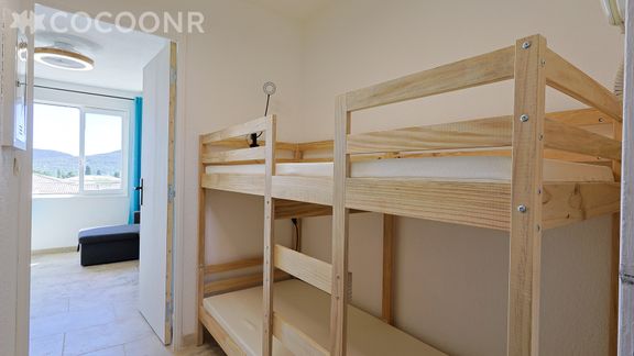 - Un espace nuit à l'entrée avec un lit superposé (deux couchages, adaptés aux enfants)