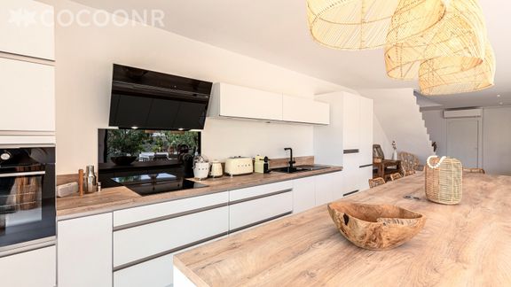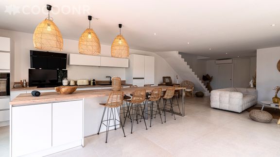 - Une pièce de vie de 80 m² avec canapé, TV, grand îlot central et accès terrasse