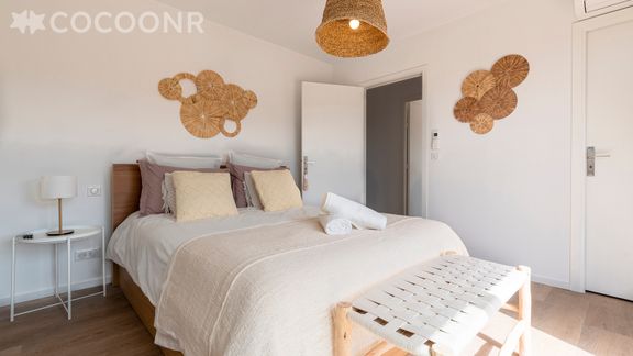 - Chambre 2 : un lit queen-size (160×200), salle d'eau avec douche et WC, accès balcon
