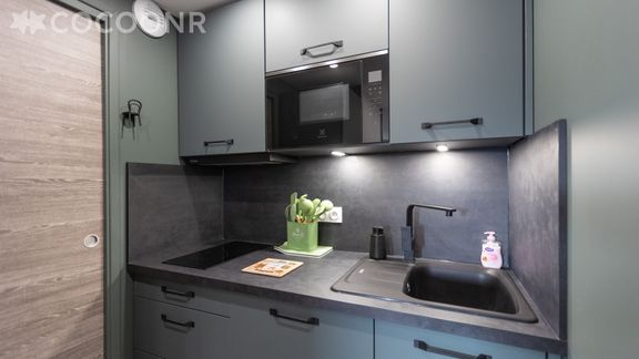 - Une cuisine équipée avec notamment : bouilloire électrique, four à micro-ondes, grille-pain, plaques de cuisson...