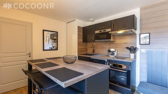 - Une cuisine ouverte équipée avec notamment : bouilloire électrique, four, four à micro-ondes, grille-pain, lave-vaisselle, plaques de cuisson...