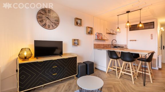 - Une pièce de vie de 20 m² avec canapé-lit double (140x190), TV, coin repas